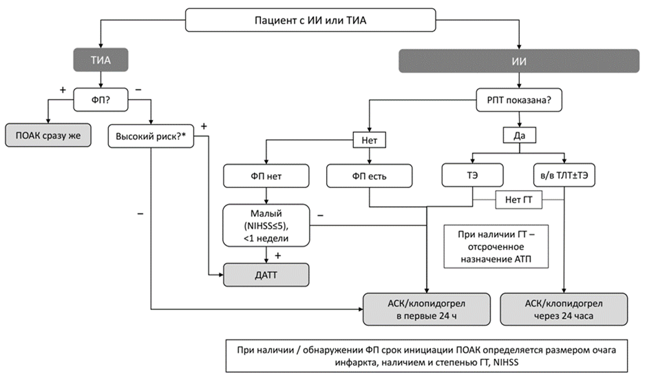 При наличии/обнаружении ФП срок инициации ПОАК определяется размером очага инфаркта, наличием и степенью ГТ, NIHSS